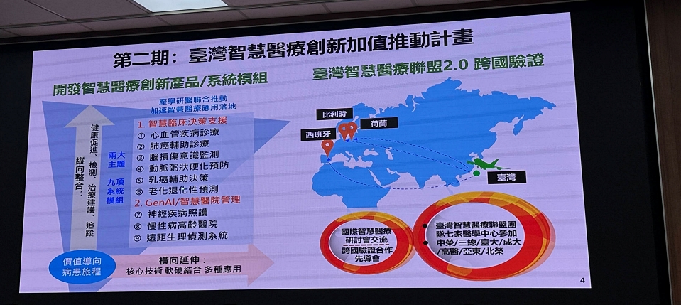 不只如此,為確保AI醫療軟體在國際上也足夠適用,第二期計畫從國內跨院驗證擴大到國際驗證。至於如何做到,國科會規畫今年先率團前往西班牙、荷蘭與比利時等地,與當地專家進行國際智慧醫療研討會,並討論後續技術驗證可行性,讓臺灣自研的醫療AI技術可於國際場域中驗證,讓產品更具通用性和說服力,同時也能引進國外技術在臺灣驗證。