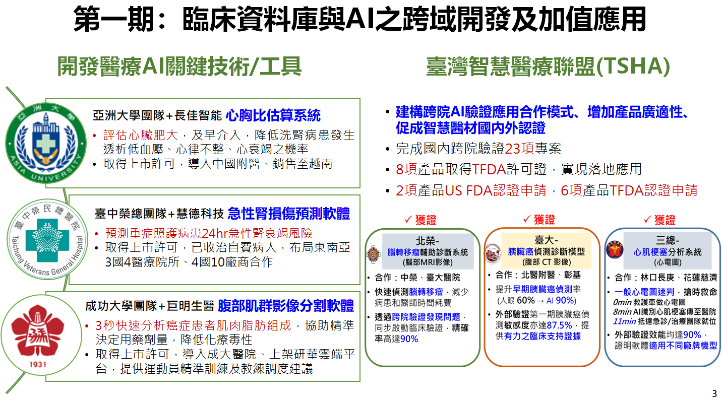 進一步來說,國科會聯手衛福部和經濟部,先是在2020年發起「臨床資料庫與AI之跨域開發及加值應用計畫」,也就是第一期智慧醫療計畫,並由國內多家醫學中心成立臺灣智慧醫療聯盟(TSHA)、以時任臺中榮總院長陳適安為召集人,來發展第一期智慧醫療系統應用。