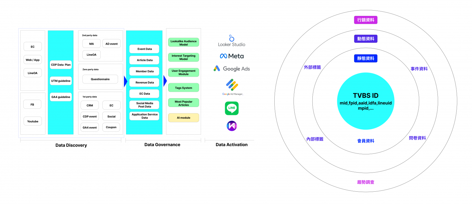 TVBS參考了Data Mesh(數據網格)與Data Fabric(數據經緯)的概念來設計新架構,前者做法是,適當將控管數據的責任指派給最靠近數據的營運端,支援不同數位通路品牌及行銷等團隊,依據時事和當下策略需求,靈活發展數位應用。