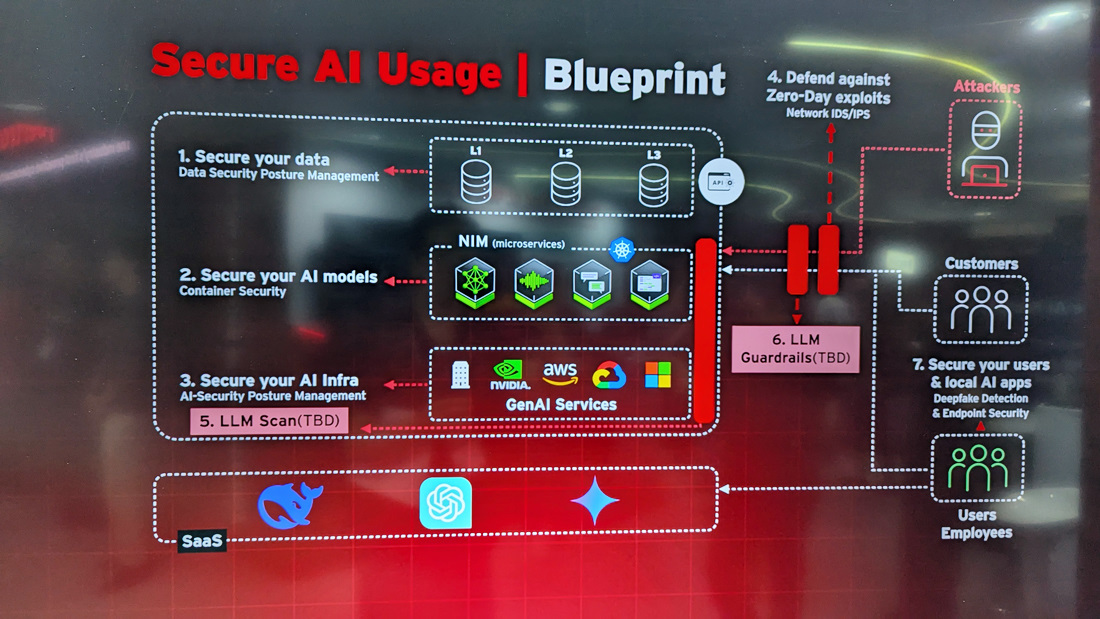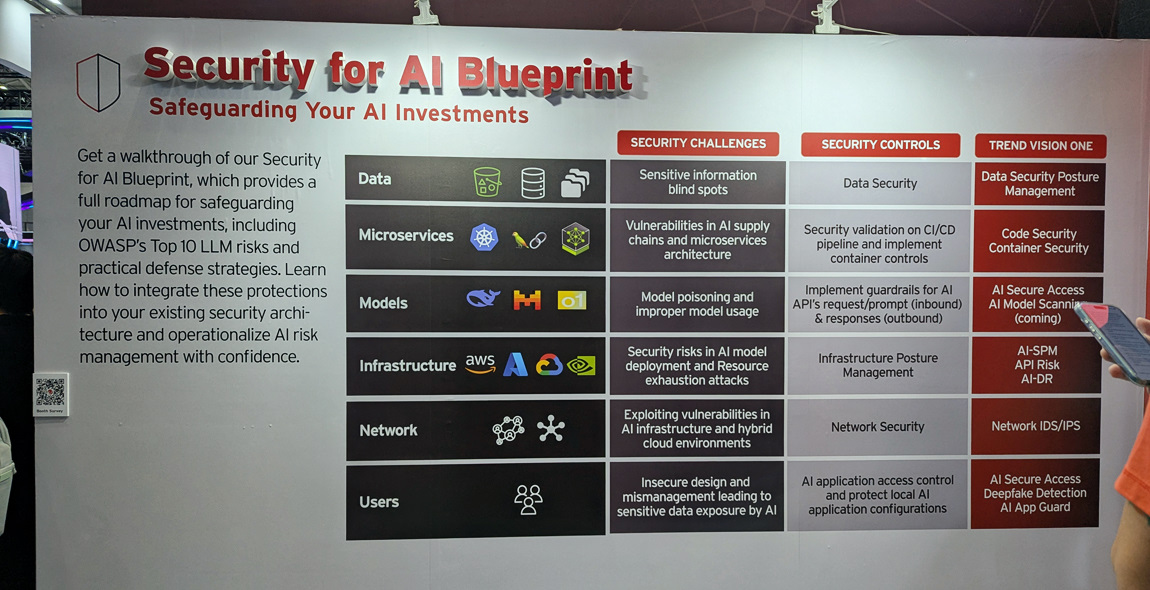 響應GPU大廠Nvidia近年持續發表AI藍圖,趨勢科技在AI資安風險領域也提出自家Security for AI Blueprint概念,強調從6大層面做到AI防護,涵蓋:資料、微服務、基礎架構、模型、網路與使用者。