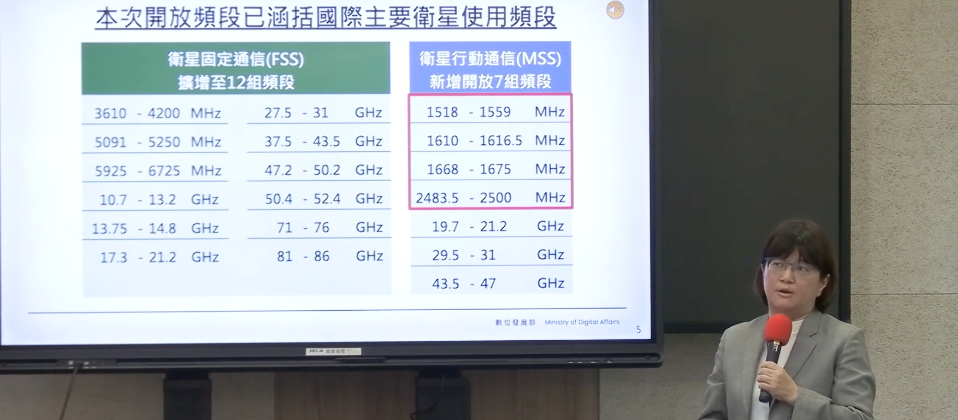 其次是新增開放頻段方面,原本衛星固定僅開放4個頻段,經過數發部過去一年盤點國際衛星使用頻段,以及國內頻段使用情形,並蒐集國內產業意見,此次將衛星固定頻段增加至12個頻段,衛星行動可使用頻段7個。
