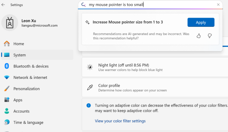 Pradeep補充,目前Mu僅應用於Windows設定代理人,並已針對此任務使用約360萬筆樣本進行微調,涵蓋數百項系統設定。模型也根據輸入語句的長度與明確程度調整回應方式,例如輸入「亮度」這類短語時會回傳傳統搜尋結果,而輸入「提高主要螢幕亮度」這類具體語句,才會由Mu代理人執行具體設定動作,以兼顧準確度與使用體驗。