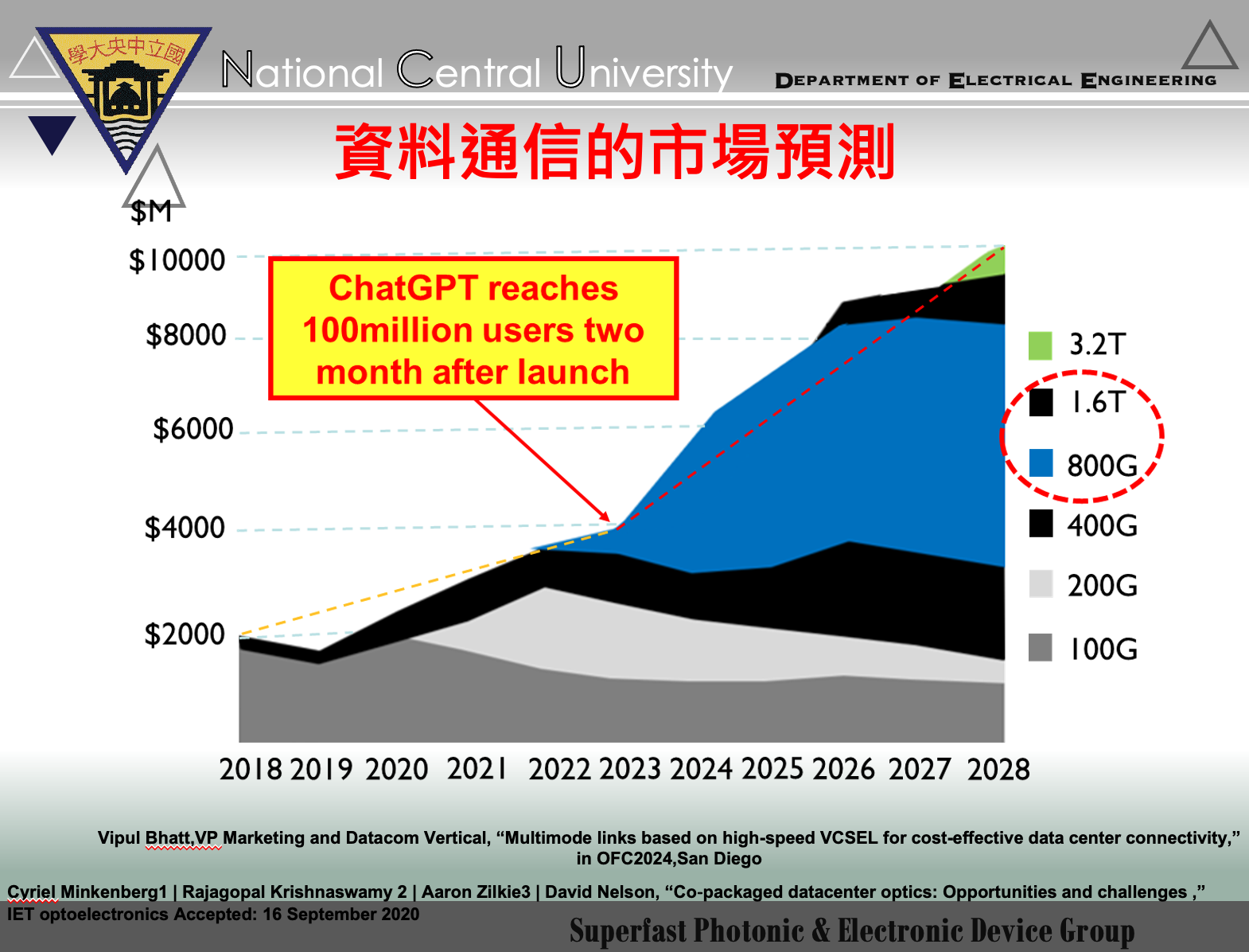 也因此,更快、更便宜、更低耗能,且能與IC晶片高密度封裝的VCSEL技術,成為團隊的研究方向。這種雷射光源在與光纖結合後,可以取代笨重且高損耗的高頻電纜線,AI機櫃的電力消耗還能大幅下降。