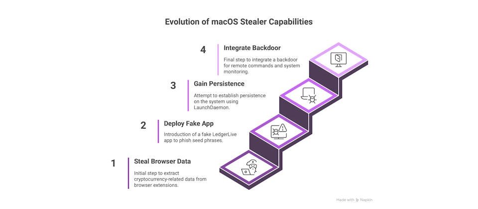 將竊資軟體與後門程式結合的做法,Atomic Stealer並非首例,北韓駭客在鎖定macOS用戶的攻擊行動裡,就積極結合這兩種惡意軟體,不過他們的目的並非為了長期在受害電腦活動,而是一口氣搜刮加密貨幣及受害者的敏感資料。