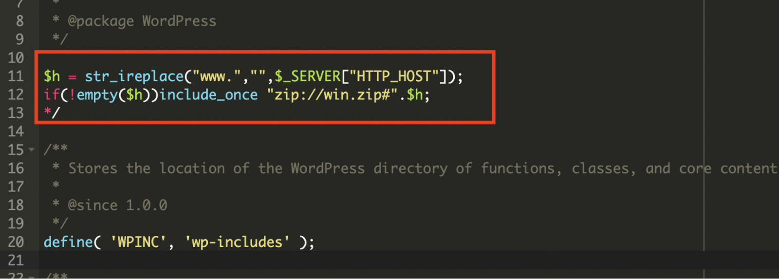 近期發生在資安業者Sucuri客戶網站的資安事故,就是這樣的例子。攻擊者在受害網站重要的WordPress元件wp-settings.php當中,插入兩行可疑的程式碼,試圖利用zip://通訊協定,從壓縮檔win.zip載入惡意的PHP檔案。Sucuri指出,這種手法相當隱密,能夠將惡意程式碼埋藏在看似無害的ZIP檔案。