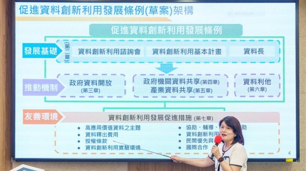 資料創新利用發展條例草案,一方面鼓勵公務機關釋出著作權的資料,也希望帶動政府機關間的共享資料,並且讓民間的產業之間也能資料共享,並研擬資料有償授權機制,希望促進政府及民間的資料經濟發展。發展條例也規定政府機關設立資料長,強化機關內資料治理、推動資料開放。