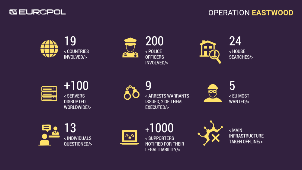 歐洲刑警組織(Europol)宣布,捷克、法國、芬蘭、德國、義大利、立陶宛、波蘭、西班牙、瑞典、瑞士、荷蘭、美國等12國執法機關與司法機關聯手,在他們與歐洲司法組織(Eurojust)居中協調之下,於7月14至17日從事跨國執法行動Operation Eastwood,對NoName057(16)的網路犯罪基礎設施採取行動。相關調查得到歐盟網路安全局(ENISA)、比利時、加拿大、愛沙尼亞、丹麥、拉脫維亞、羅馬尼亞、烏克蘭的支持,資安機構Shadowserver基金會與abuse.ch也從中提供技術支援。