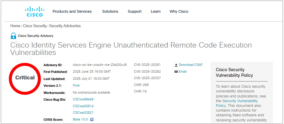 最新漏洞影響思科網路存取控制平臺ISE(Identity Services Engine,ISE),以及ISE被動身分識別連接器(Passive Identity Connector,ISE-PIC)。這3項分別是6月份公告的CVE-2025-20281、CVE-2025-20282及上周公告的CVE-2025-20337,皆為CVSS score 10的遠端程式碼執行漏洞。