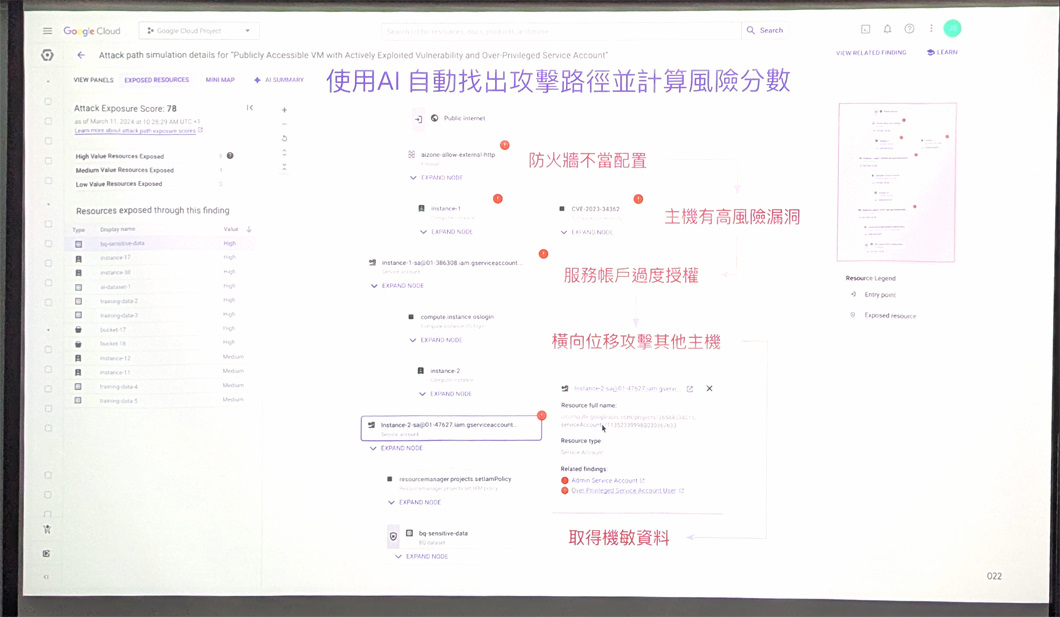 更重要的是,不只侷限於偵測單一配置問題,現在更已發展出透過 AI 自動「識別高風險組合」的能力。鄭家明舉例,不僅是發現防火牆不當配置,再結合找到主機有高風險漏洞,加上還有服務帳戶過度授權等情形,進而透過AI自動找出攻擊路徑,並快速計算整體風險分數。