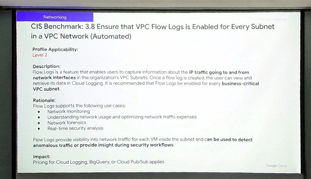 過去許多資安專家不斷強調,企業上雲時,應該啟用VPC Flow Log功能,基本上,在CIS Benchmark中,就有此項針對網路控制的要求,建議啟用VPC Flow Log,該份文件的內容也會闡釋這麼做的用意與產生的衝擊,也會標示安全層級為Level 2與可自動化執行。