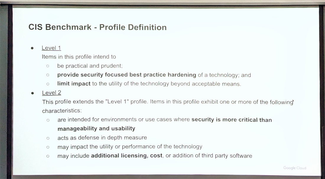 首先,CIS Benchmark將控制項的特性,依照安全強度與實作難度,區分為Level 1與Level 2兩個層級。