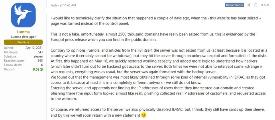 在執法行動之後,Lumma Stealer主要開發者於5月24日在地下論壇XSS透露災情。首先,他們有近2,500個網域名稱遭到封鎖,再者,因為伺服器設備位處執法機關難以管轄的地區,並未遭到沒收,執法機關採取破壞資料的方式進行,他們利用Dell整合式遠端存取控制器( Integrated Dell Remote Access Controller,iDRAC)的未知漏洞,入侵伺服器並格式化磁碟。