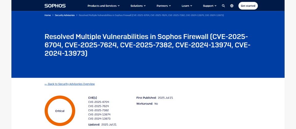 影響產品而言,CVE-2025-6704、CVE-2025-7624和 CVE-2025-7382影響Sophos Firewall v21.5 GA(21.5.0)及之前版本。而CVE-2024-13974及CVE-2024-13973影響Sophos Firewall v21.0 GA(21.0.0)及之前版本。