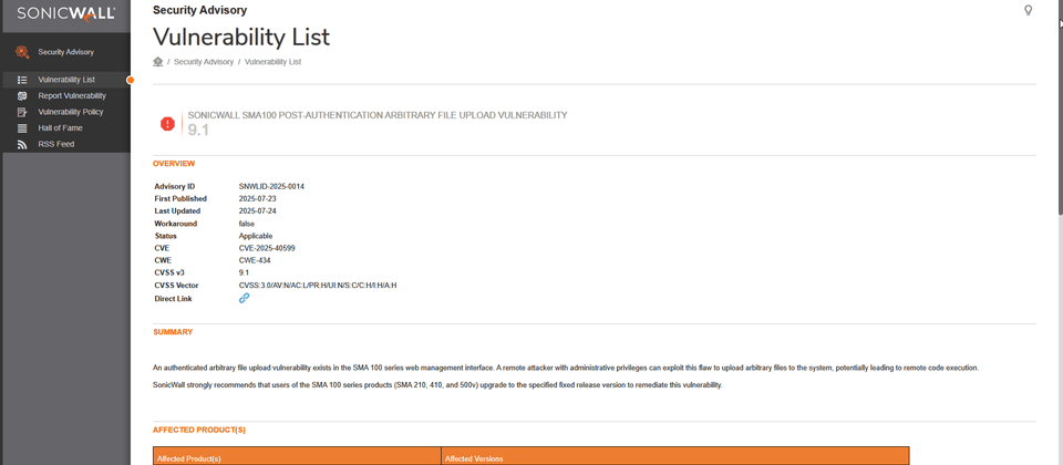 7月23日資安業者SonicWall發布資安公告,指出旗下Secure Mobile Access(SMA)100系列的SSL VPN設備存在重大層級的後身分驗證任意檔案上傳漏洞CVE-2025-40599,由於7月中旬Google威脅情報團隊(GTIG)才揭露鎖定該廠牌SSL VPN設備的攻擊行動,駭客企圖部署惡意軟體Overstep,因此這份公告格外引起注意。