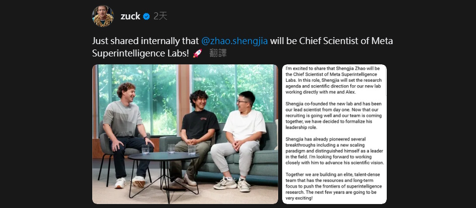 Zhao原為OpenAI的研究科學家,主導合成資料,並曾參與ChatGPT、GPT-4、所有迷你模型及o3等關鍵模型的建置,其實祖克柏在6月底宣布成立MSL時所公布的11人小組中,便已包含Zhao。