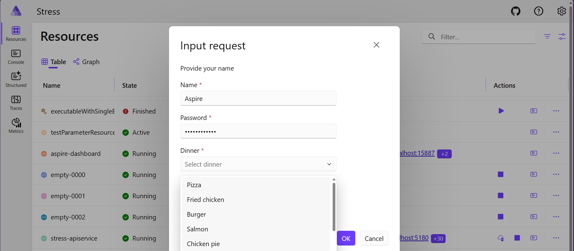 當應用啟動或部署時,儀表板會根據AppHost定義,自動彈出對話框提示使用者輸入尚未設定的參數,包括文字、密碼、數值、選項與布林等多種值。這減少了開發人員維護多分本地設定檔的負擔,同時可利用Markdown說明各個欄位。