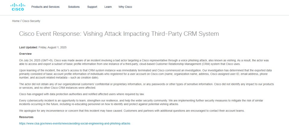 思科上周說明,該公司7月24日得知一名思科客戶代表遭語音釣魚(vishing)鎖定得逞,因而得以從該公司使用的第三方雲端平臺客戶關係管理(CRM)系統的一個執行個體中存取並外洩一部份用戶資訊。