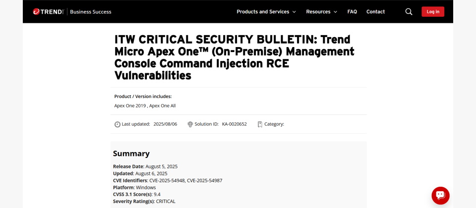 漏洞出現在端點防護產品Apex One Management Console。這2項漏洞分別是CVE-2025-54948和CVE-2025-54987。其中CVE-2025-54948為指令注入RCE漏洞,可讓遠端攻擊者不需經過驗證上傳惡意程式碼,在受害系統上執行指令。CVE-2025-54987和CVE-2025-54948基本上相同,差別是鎖定不同CPU架構的裝置。2漏洞風險值皆高達CVSS score 9.4。