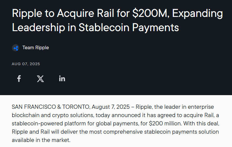 美國數位資產基礎設施公司Ripple上周四(8/7)宣布,將以2億美元收購加拿大的支付基礎設施公司Rail,藉此整合雙方優勢,提供市場上最完整的穩定幣跨境支付解決方案。交易仍需取得相關監管機關批准,預計於2025年第4季完成。