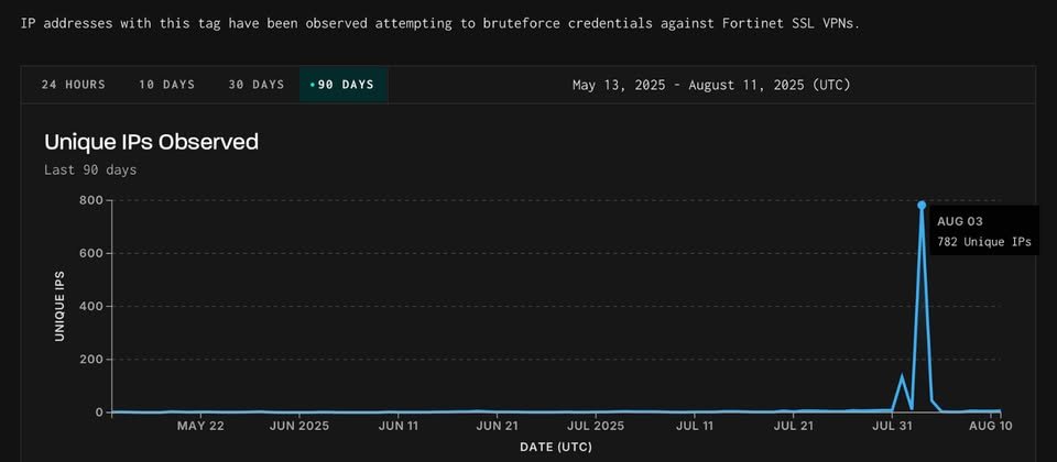威脅情報業者GreyNoise揭露自8月3日出現的攻擊行動,駭客針對Fortinet SSL VPN系統而來,在一天內透過782個IP位址試圖進行暴力破解。事隔兩天,他們偵測到第二波攻擊,攻擊者使用完全不同的TCP行為特徵犯案,這種情況引起GreyNoise的注意並著手調查。