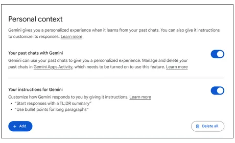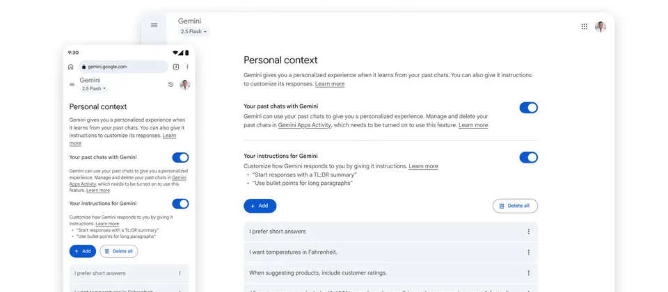 其中,個人化脈絡類似ChatGPT與Claude的記憶功能,它讓Gemini能夠自動記住使用者過往對話中的關鍵細節與偏好,讓AI在日後回應時更貼近需求,無需再次輸入相同背景。例如,若先前曾與Gemini討論日本文化的YouTube頻道,未來再詢問影片靈感時,AI可能主動建議嘗試日本美食或傳統手工藝影片。不過此功能僅限18歲以上用戶使用,初期適用於部分國家的Gemini 2.5 Pro模式,後續將擴展至Gemini 2.5 Flash與更多地區。