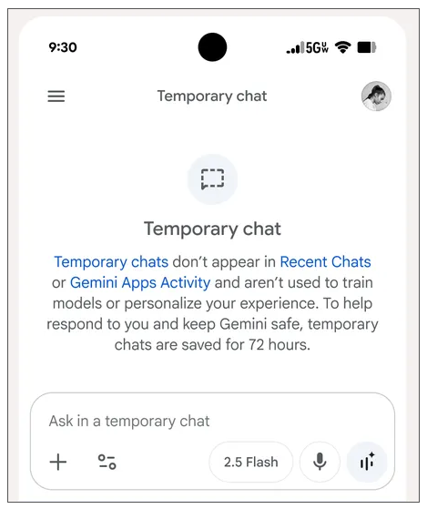 針對隱私需求,Google新增「臨時聊天」模式,讓使用者可進行一次性對話,不會影響個人化設定,也不會出現在近期對話或保留活動紀錄中,且內容不會用於訓練AI模型。臨時聊天資料僅保存72小時,適合探索私密議題或避免後續引用。