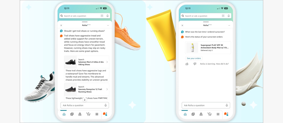 2024年2月,Amazon就兌現前一年打造對話式購物助手的預告,開始試用AI購物助理Rufus,隨後於8月將其作為正式功能整合到電商App。Rufus是一個聊天機器人,可以搜尋、比較商品價格及規格、回答商品相關問題及其他模糊問題、推薦產品、主動更新產品最新消息。不只如此,還可以根據顧客過往資料,給出個人化答覆。