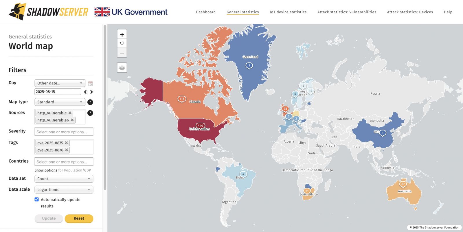 8月17日Shadowserver基金會提出警告,他們在15日發現全球仍有1077個IP位址部署的N-central平臺當中,使用舊版的應用系統而面臨這些資安漏洞的風險,其中最嚴重的國家包含了美國、加拿大、荷蘭、英國,分別有440臺、112臺、110臺、98臺。