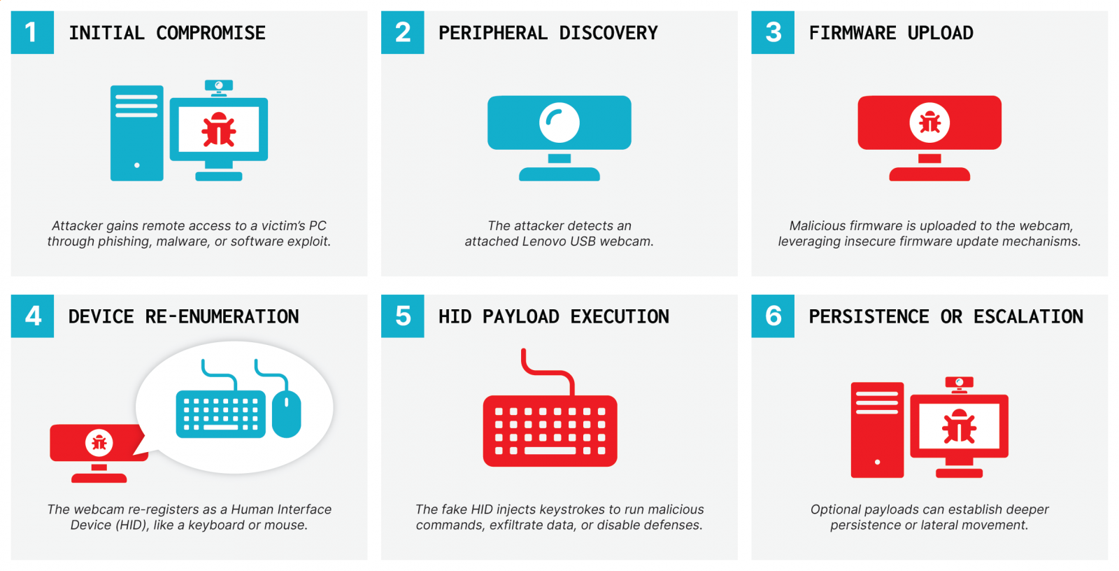 10年前資安研究室Security Research Labs(SR Labs)於黑帽大會揭露BadUSB攻擊手法,攻擊者藉由改寫USB控制器,就能將USB裝置用於不法,不久後有兩名研究人員DerbyCon展示概念驗證手法,使得這種資安威脅受到外界關注,但過往通常是攻擊者打造特製的裝置來進行,如今有資安業者指出,他們能透過特定型號的USB網路攝影機來進行這類攻擊。