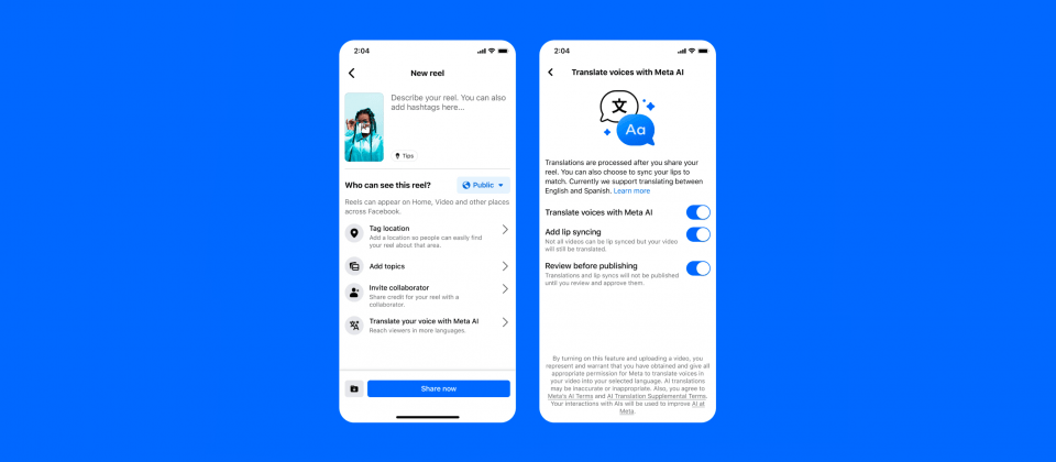 Meta正式向臉書與Instagram創作者開放Meta AI翻譯功能,讓Reels影片能透過自動配音與嘴型對齊功能進行跨語言呈現。此功能免費提供,首波支援英語與西班牙語雙向翻譯,臉書方面限於粉絲數達1,000以上的創作者使用,Instagram則全面開放給所有公開帳號。