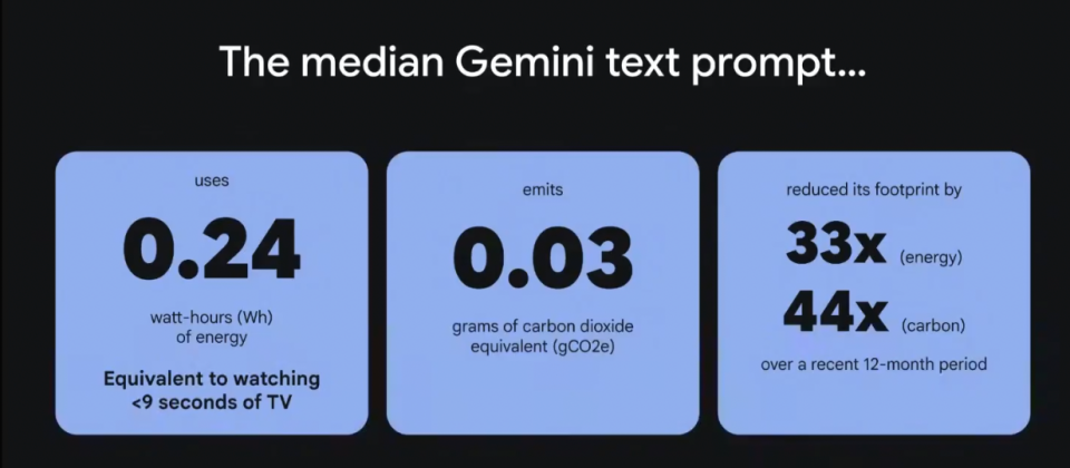 Google率先公布了Gemini模型的能源消耗數據,「透過我們完整的估算方式,一次平均長度文字提示,Gemini要消耗約0.24瓦小時的能源,相當於觀看9秒電視的功耗。排放0.03克的二氧化碳。」Google先進能源實驗室首席Savannah Goodman表示。