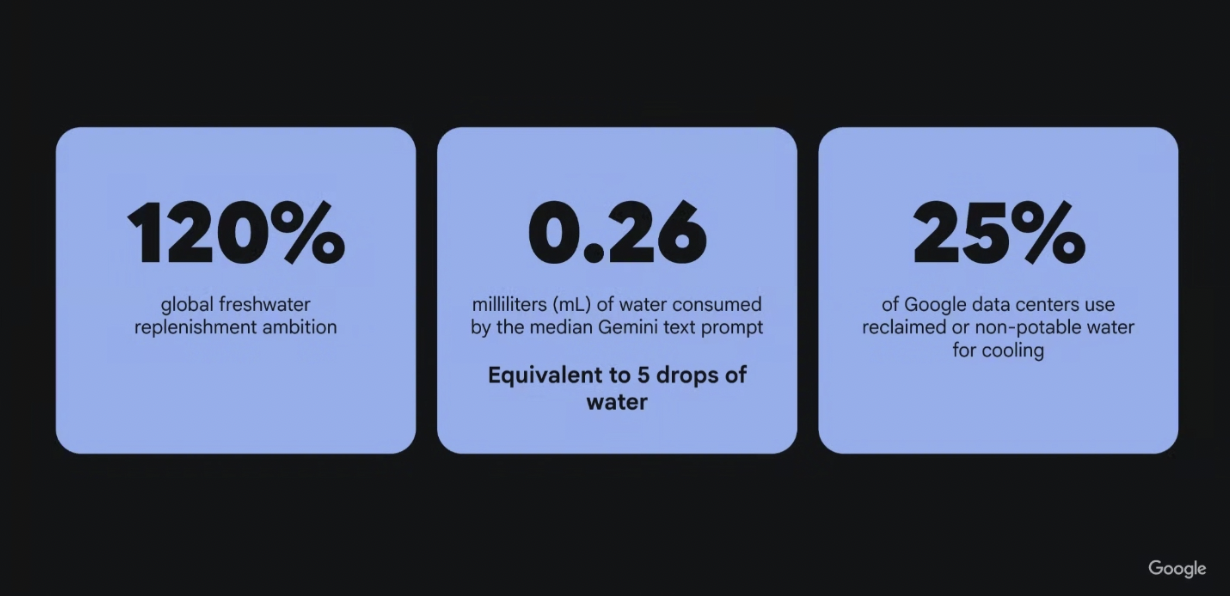 不只碳排放量,Google也將水消耗量加入了AI碳足跡的追蹤項目之中。Google基礎架構永續性主管Ben Townsend表示,根據Google估算,每一次Gemini文字提示查詢,約消耗了0.26毫升的水,大約是5滴水。Google在不少地方的資料中心採取了水冷式的資料中心,可以比氣冷式資料中心,減少1成能源消耗,也意味著可以減少10%碳排。Google也有超過25%的資料中心,使用再生水或非飲用水來進行冷卻。