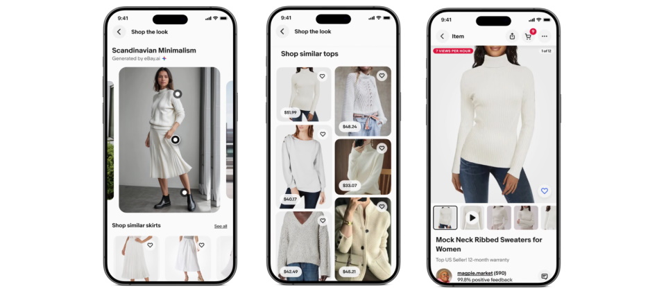 eBay上的互動式服飾購物體驗「Shop the Look」,是一個全新的商品探索模式。系統利用生成式AI從顧客購物歷史分析可能喜好,再生成一系列穿搭範例圖。顧客可以點擊圖片上的不同元件,在eBay站上尋找相似商品。