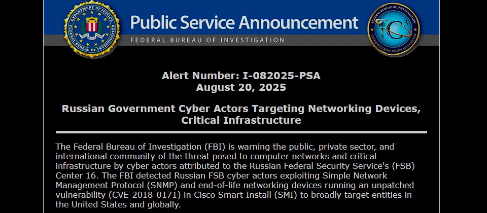 FBI近日偵測到和俄羅斯情治機關FSB(Federal Security Service)Center 16相關的駭客,濫用執行思科Cisco Smart Install軟體的舊式網路設備漏洞CVE-2018-0171,以及簡單網路管理協定(Simple Network Management Protocol,SNMP)來攻擊思科用戶。