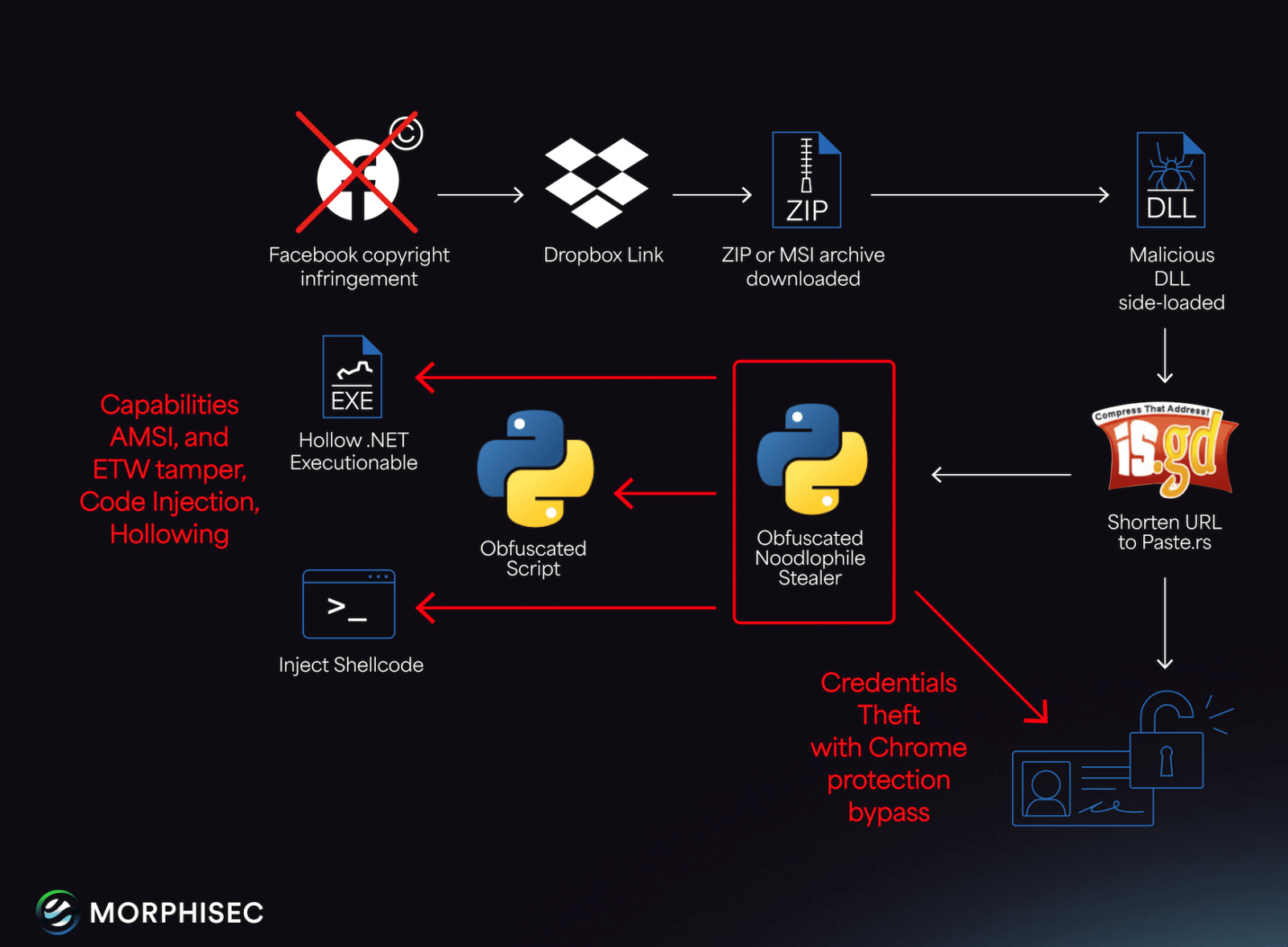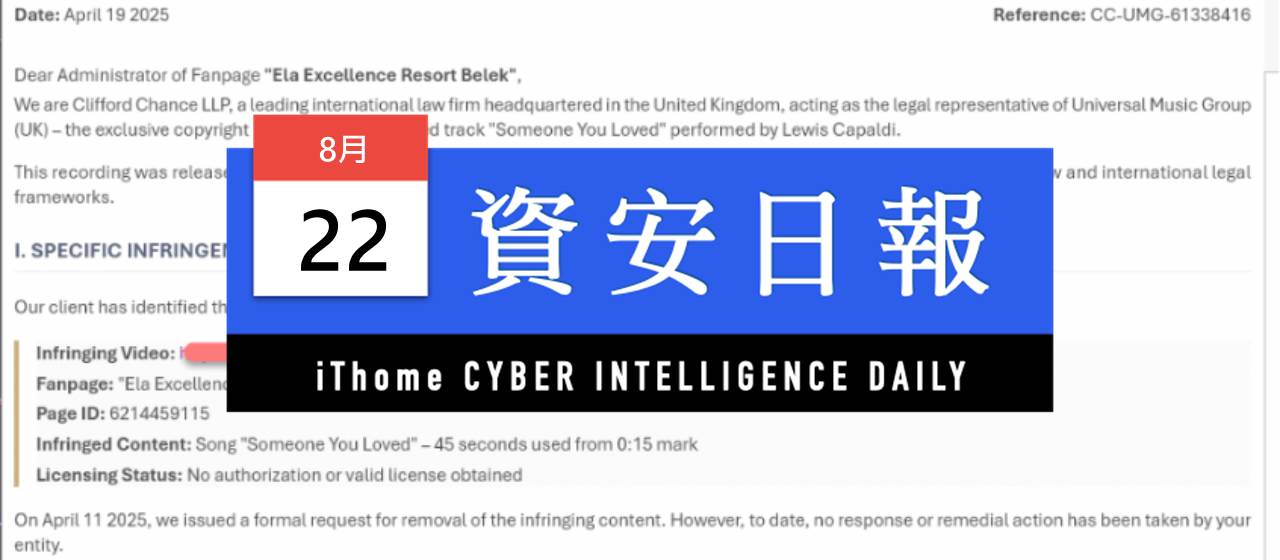 此事是源於資安業者Morphisec,他們揭露竊資軟體Noodlophile Stealer最近一波攻擊行動,駭客犯案的範圍,遍及亞太地區、美國、歐洲、波羅的海國家,而散布這款惡意程式的方式,就是透過前述的違反著作權網釣來進行。但不同的是,駭客疑似透過廣泛的偵察,在信中列出臉書的網頁ID,以及公司所有權等資訊,並針對攻擊目標,透過AI將信件內容翻譯成特定的語言。這樣的攻擊手法,在過往以侵權為幌子的攻擊行動裡,算是相當罕見。
