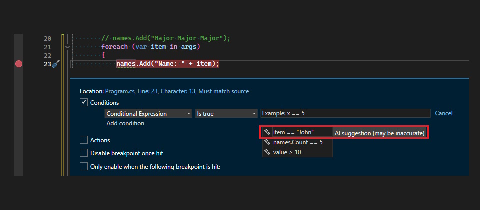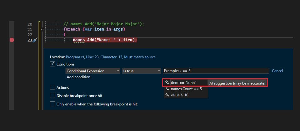Visual Studio的中斷點與追蹤點現在新增Copilot輔助,能依據程式脈絡自動建議條件判斷式或追蹤動作,減少人工設定的時間。對於常見的非繫結中斷點(Non-binding Breakpoint),Copilot可即時分析可能原因,例如符號檔不符、編譯設定錯誤或最佳化編譯帶來的影響,並提供修正建議。