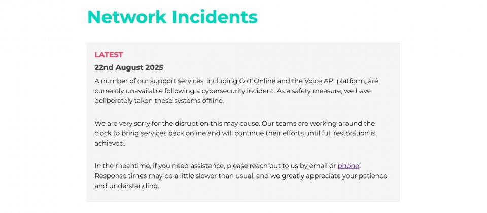 英國電信商Colt公告,其業務支援系統遭遇資安事件,攻擊者已在暗網張貼部分檔名清單,並聲稱取得資料,為此Colt正持續調查與復原,承諾隨時公布進展。
