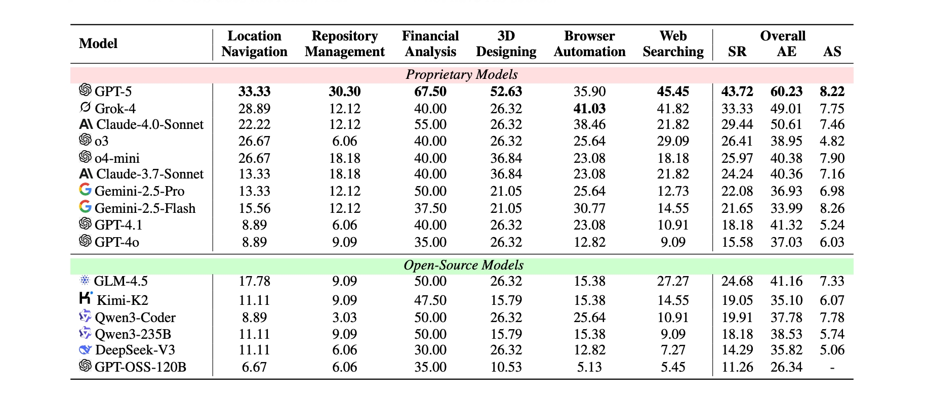 在多模型對照中,GPT-5的43.72%成功率居首,xAI的Grok-4為33.33%,Anthropic的Claude-4.0-Sonnet則為29.44%。研究人員進一步分析指出,當互動步驟增加導致脈絡過長,或遇到參數格式各異的工具時,模型表現會明顯下滑。此外,子領域成績落差也相當大,例如GPT-5在財務分析任務中達到67.5%的成功率,但在地理導引與版本庫管理上表現不佳。