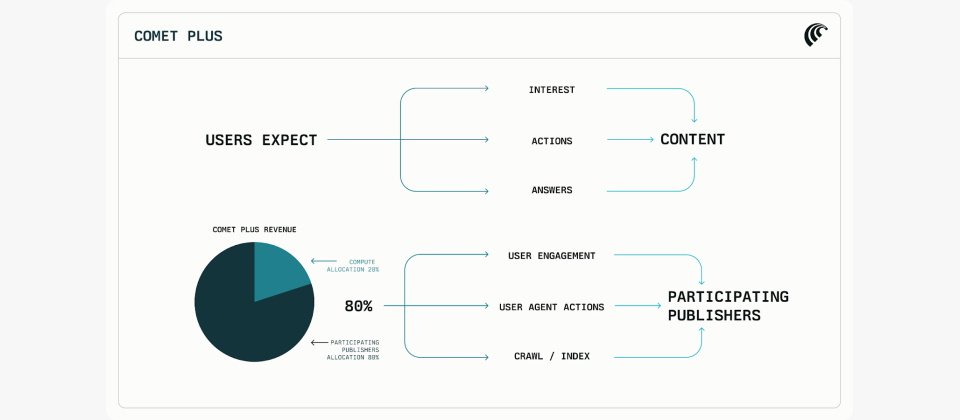 而Comet Plus則是首個用來反映使用者對網路需求的商業模式,訂閱者可以直接存取合作出版商的網站與內容,或讓其AI助手於這些網站上完成任務,並自這些內容所產出的答案中受益。