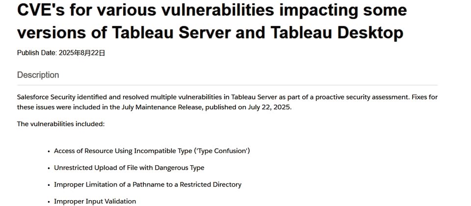 8月22日Salesforce發布資安公告,指出他們在一個月前推出的商業智慧分析軟體Tableau Server、Tableau Desktop更新2025.1.4、2024.2.13、2023.3.20當中,一共修補5項高風險資安漏洞,這些漏洞涉及類型混淆(Type Confusion)、未限制危險類型檔案上傳、禁用資料夾的路徑名稱進行未妥善設限,以及輸入驗證不當等問題,CVSS風險介於7.7至9.6。