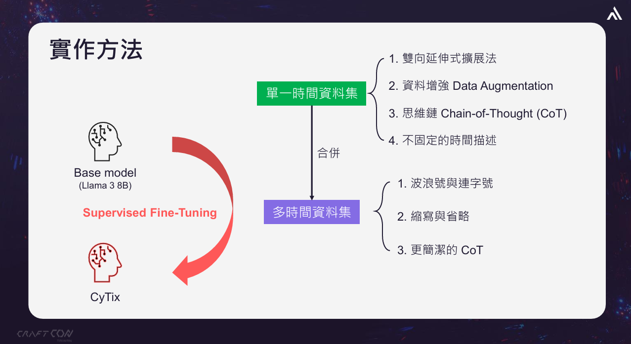 最後,透過Supervised Fine-Tuning方式,將多時間資料庫學習起來,進而建構出他們的CyTix模型。另外,謝沛錫也強調,這雖然是以啟發式資料訓練,但仍具備超越訓練情境的泛化能力,可以解析不在訓練資料集出現的時間格式。