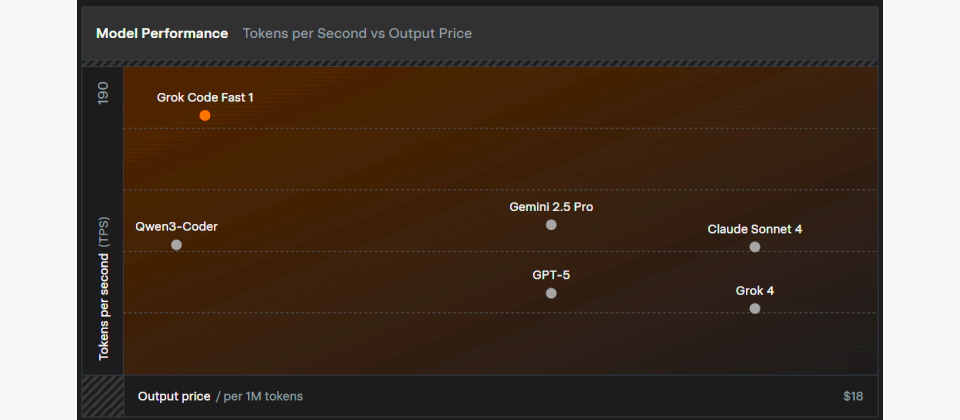 相較於市場上其它的程式代理人模型,Grok Code Fast 1強調的是快與便宜。根據xAI的說法,它在使用者還沒讀完模型的思考軌跡時,便已完成數十次的工具呼叫;並藉由提示快取(Prompt Caching)技術,創下90%以上的快取命中率,以加速針對重複脈絡的回應;每秒可輸出190個Token,快過Claude Sonnet 4與Gemini 2.5 Pro等競爭模型。
