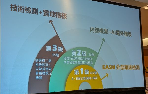 蔡福隆提到目前規畫分為3級,第1級針對A、B級機關進行EASM外部曝險檢測,檢測外網是否存在風險;第2級則是遴選行政院的2級機關或是曾受資安會報稽核的機關,作內部檢測並利用AI作場外監控、稽核;第3級檢測則是遴選前2級較高風險及未曾受資安會報稽核的機關,進行技術檢測及實地稽核。