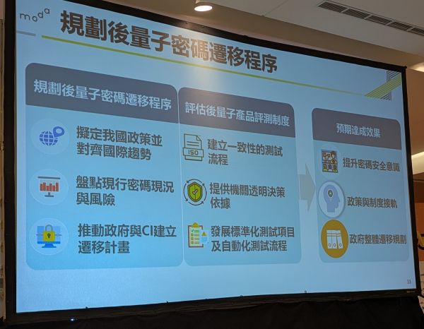 對於後量子密碼遷移程序,蔡福隆指出,除了參考國際趨勢,現階段會盤點政府機關及CI的現行密碼及風險,預計年底前訂定後量子密碼遷移政策,包括對自然人憑證、醫事憑證、工商憑證等重要憑證,未來面對後量子密碼因應及遷移,同時也會參考國際標準,對後量子產品建立驗測機制。