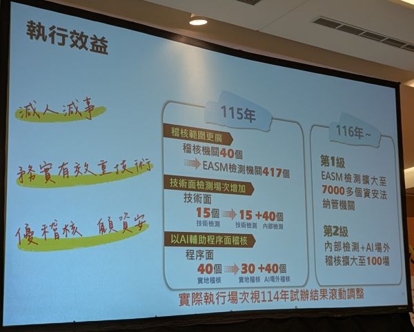今年先試辦分級制度,明年計畫擴大稽核能量,2026年從原先稽核40個機關擴大為EASM檢測417個機關;在技術面檢測方面,從原本的15個場次提升為15個技術檢測加上40個內部檢測;至於AI輔助的程序面稽核,從原本的40個實地稽核擴大為30個實地稽核加上40個AI場外稽核。到了2027年,第1級EASM檢測機關將擴大到資安法納管的7,000個機關;第2級內部檢測加上AI場外稽核將擴大到100場。
