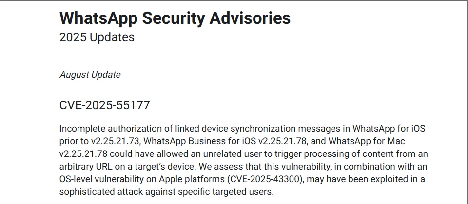 該漏洞命名為CVE-2025-55177,影響WhatsApp iOS、WhatsApp Business及WhatsApp for Mac。