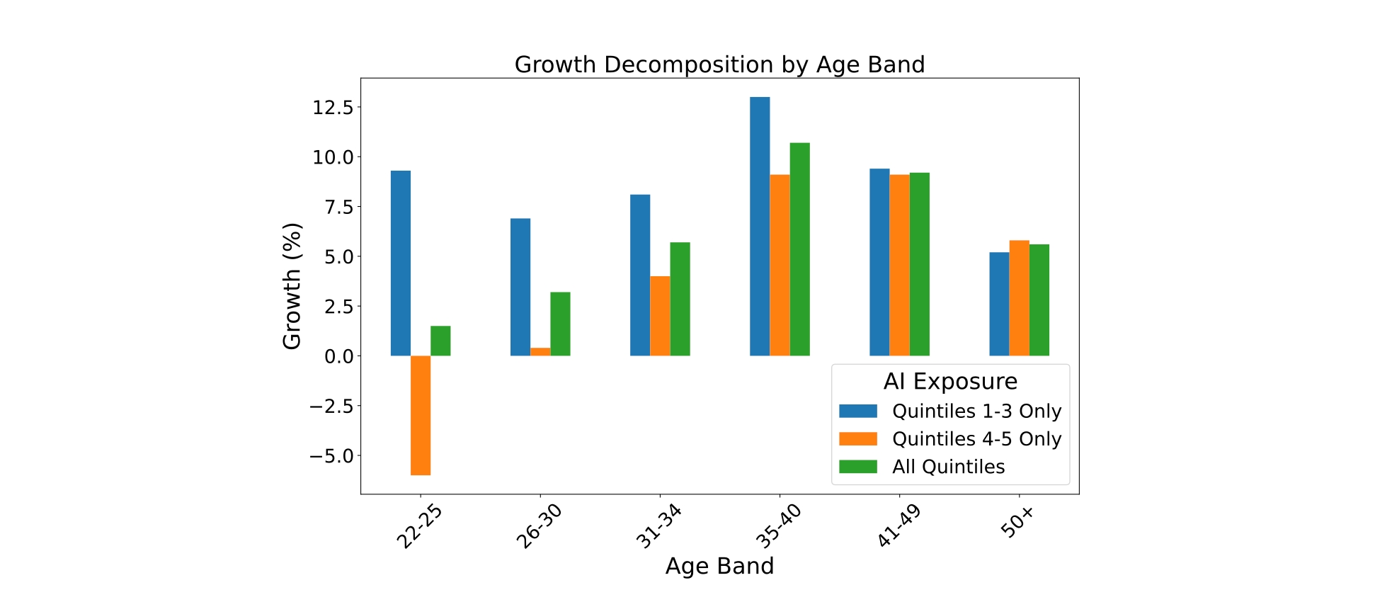 史丹佛大學研究顯示,生成式人工智慧普及後,美國部分人工智慧高曝險職業的新鮮人就業已經出現下滑。根據美國的人力資源與薪資服務公司Automatic Data Processing(ADP)提供的龐大薪資管理資料,涵蓋數百萬名員工與數萬家企業,觀察至2025年7月,高度涉及人工智慧的職業中,22至25歲群體的就業,從2022年底起明顯減少,其中軟體開發與客服職務最為明顯。相較之下,35至49歲在相同職類中就業則持續增加,反映出整體就業擴張下,年輕族群的機會正被壓縮。