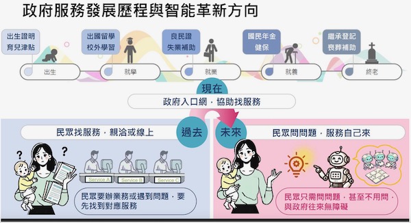 在數位政府及為民服務的發展上,過去政府為民服務是以人工臨櫃服務,後來發展到線上服務,民眾除了到機關辦理服務之外,可在家透過電腦上網線上申請服務,發展到現在政府以入口服務網的方式,提供民眾一站式服務,然而,不論是線上服務或是一站式服務,民眾都需要自行上網尋找能解決遭遇問題的合適服務,對於高齡或不善於使用電腦、手機的族群而言,並不容易使用這些服務。而未來的政府服務將朝向智慧服務發展。