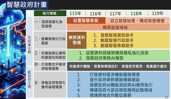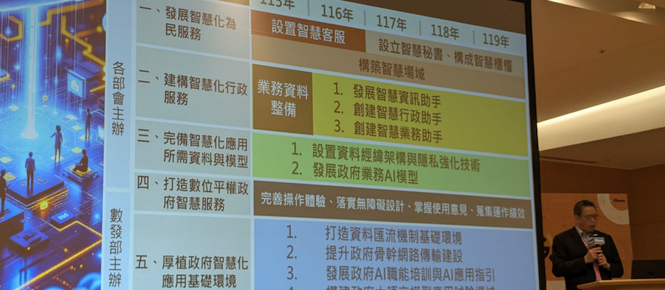 目前數發部提出2026年到2030年的智慧政府計畫,兩大目標為發展智慧化的為民服務、智慧化行政服務,前者除了先打造智慧客服,還將建置智慧祕書、智慧櫃檯來服務民眾;後者的智慧化行政服務,主要發展智慧化的行政、資訊、業務助手,提高機關行政辦公的效率。
