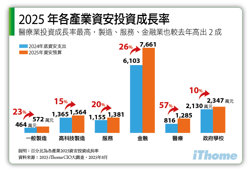 以各產業來看,金融業的資安預算年年居各產業之冠,今年亦不例外,但從資安投資成長率來看,今年最高是醫療業(增加5成7),金融業、一般製造業、服務業次之,這些產業的成長率都能達兩成以上,突顯這些產業對資安的重視程度持續升高。